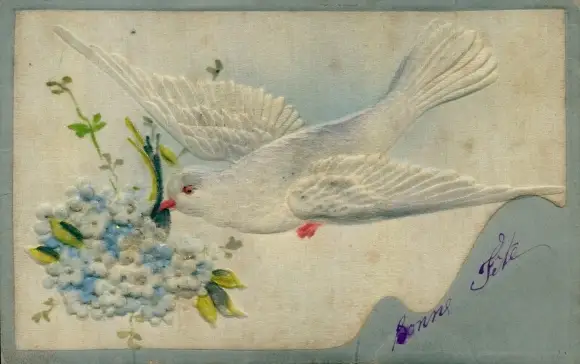 Präge Stoff Ak Taube mit Blumenstrauß, Vergissmeinnicht