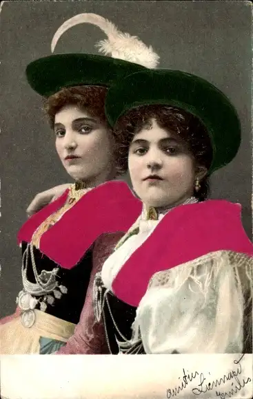 Präge Stoff Ak Zwei Damen in Trachten, Dirndl, Hüte