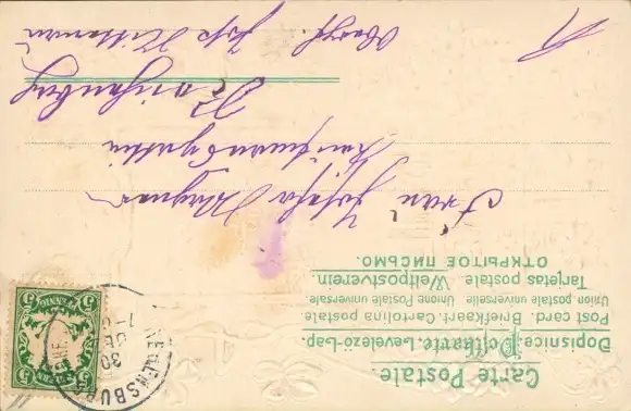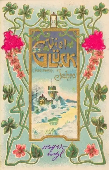 Präge Stoff Litho Glückwunsch Neujahr, Glücksklee, Blumen