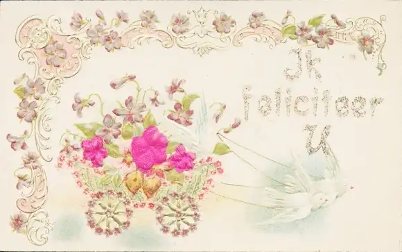 Präge Stoff Litho Karren, Blumen, Taube, Kitsch