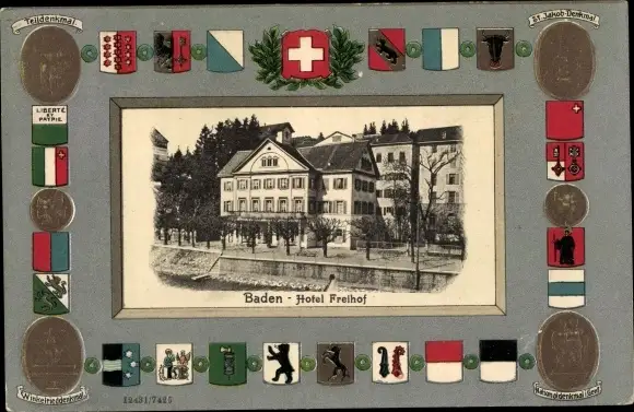 Präge Wappen Ak Baden Kanton Aargau Schweiz, Hotel Freihof
