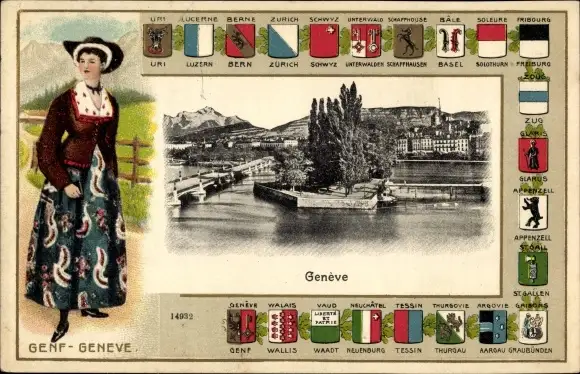 Präge Wappen Ak Genf Schweiz, Frau in Tracht, Wappen, Blick zum Ort