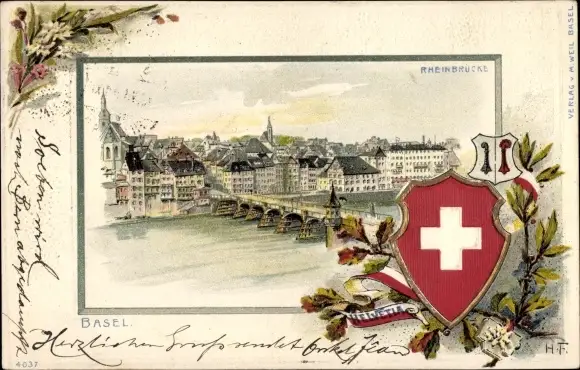 Präge Wappen Litho Bâle Basel Stadt Schweiz, Stadtansicht mit Rheinbrücke