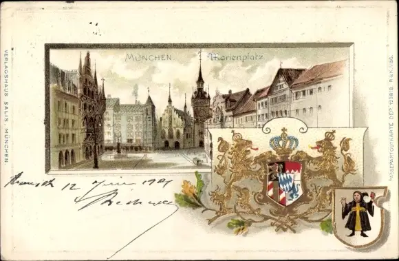 Präge Wappen Litho München, Marienplatz, Münchner Kindl