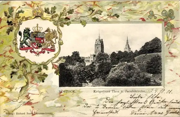 Präge Wappen Passepartout Ak Hansestadt Rostock, Kröpeliner Tor, Jakobikirche