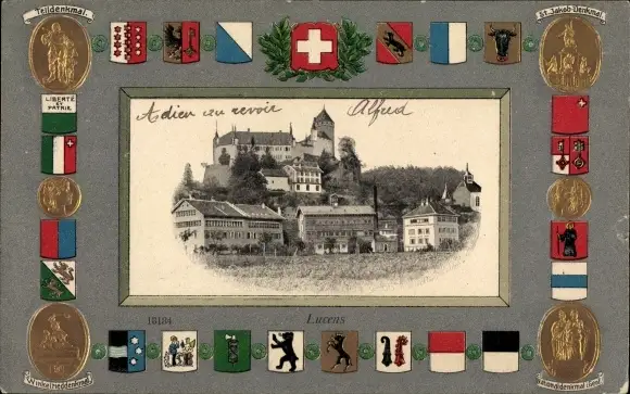 Präge Wappen Passepartout Ak Lucens Kanton Waadt, Ortsansicht, Telldenkmal, St. Jacob Denkmal