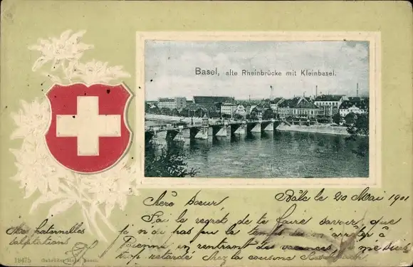 Präge Wappen Passepartout Ak Neuchâtel Neuenburg Stadt, alte Rheinbrücke mit Kleinbasel