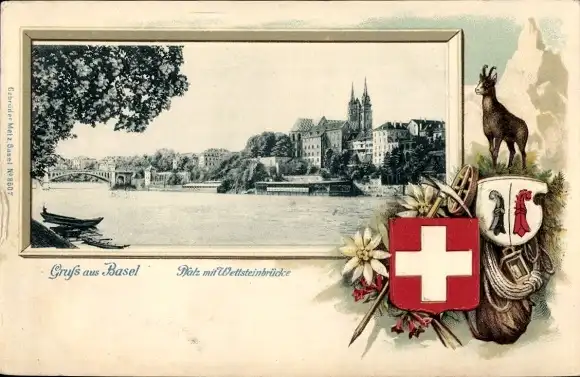 Präge Wappen Passepartout Litho Basel Bâle Stadt Schweiz, Pfalz mit Wettsteinbrücke