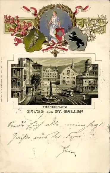 Präge Wappen Passepartout Litho Sankt Gallen Stadt Schweiz, Theaterplatz