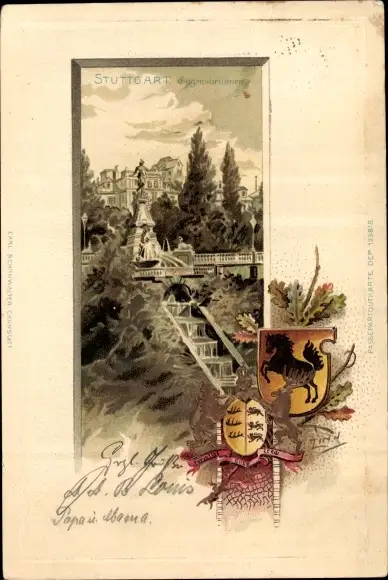 Präge Wappen Passepartout Litho Stuttgart in Baden Württemberg, Eugensbrunnen