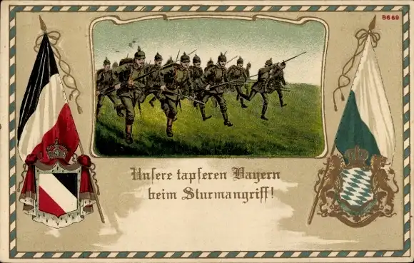 Präge Wappen Passepartout Litho Tapfere Bayern beim Sturmangriff