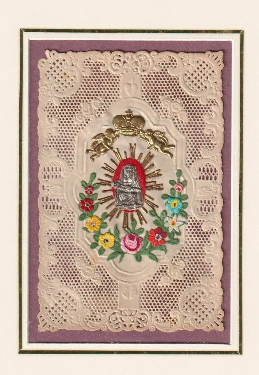 Bemerkungen: Auf dünnem Stanzspitzenpapier ist mittig ein Pieta-Gnadenbild, möglicherweise aus Maria Taferl oder Maria Dreieichen, montiert. Darüber halten zwei Engel eine Krone.