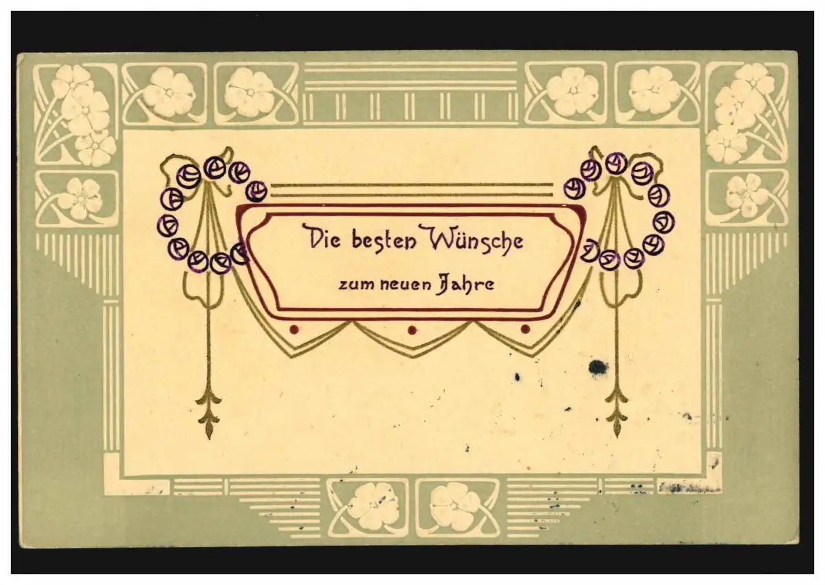 Prägekarte Neujahr Weiße Blüten in der Umrandung, CREFELD 31.12.1907