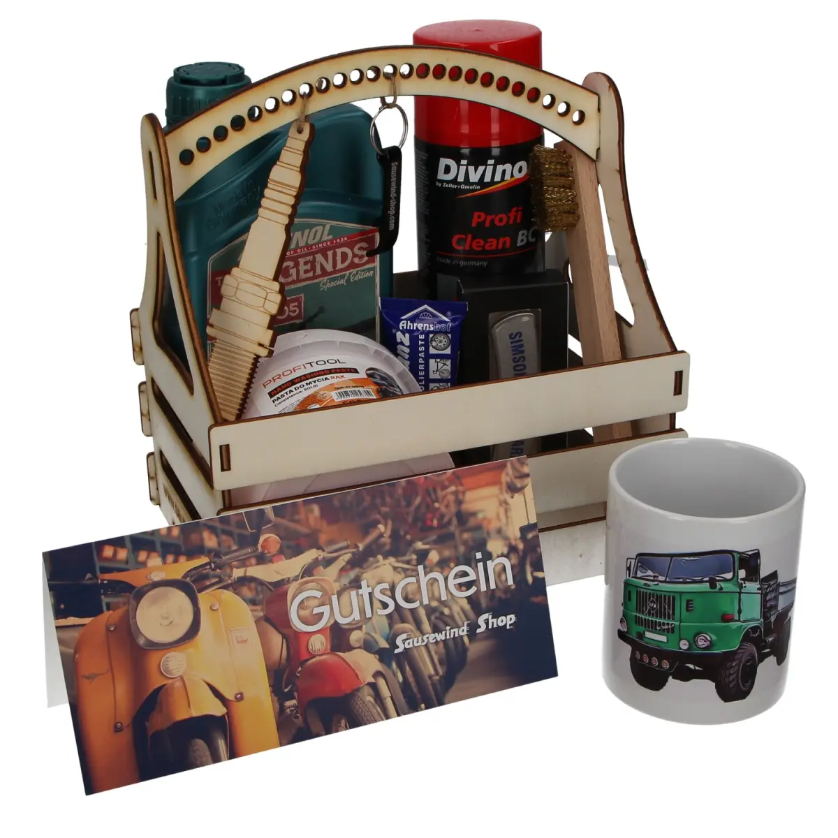 Gefüllt mit nützlichem Zubehör und hochwertigen Pflegeprodukten, ist er das perfekte Geschenk für alle, die ihren W50 in Topform halten möchten.