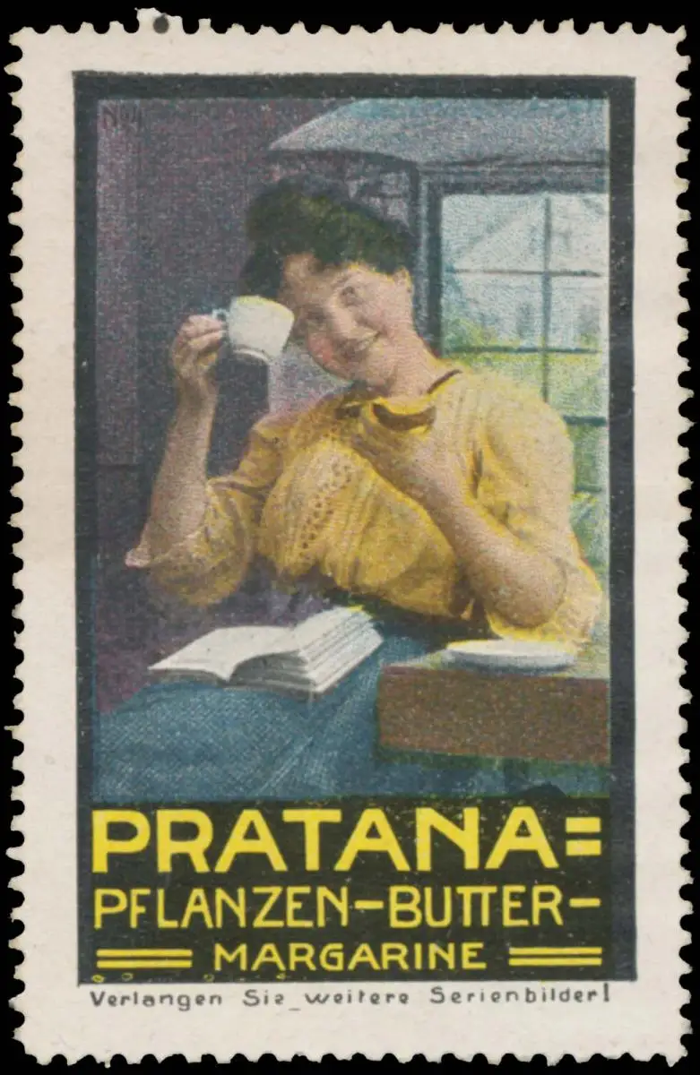 Frau mit Buch und Stulle zum Kaffee, Größe/Zustand: 6x4 , guter Zustand, Original alte Reklamemarke die seinerzeit für die Werbung benutzt wurde
