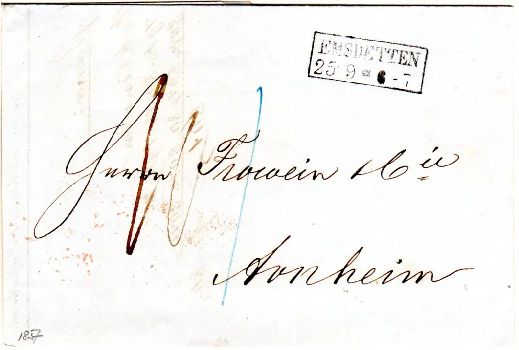 Preussen 1857, R2 Emsdetten auf Porto Brief n. Arnheim, NL.