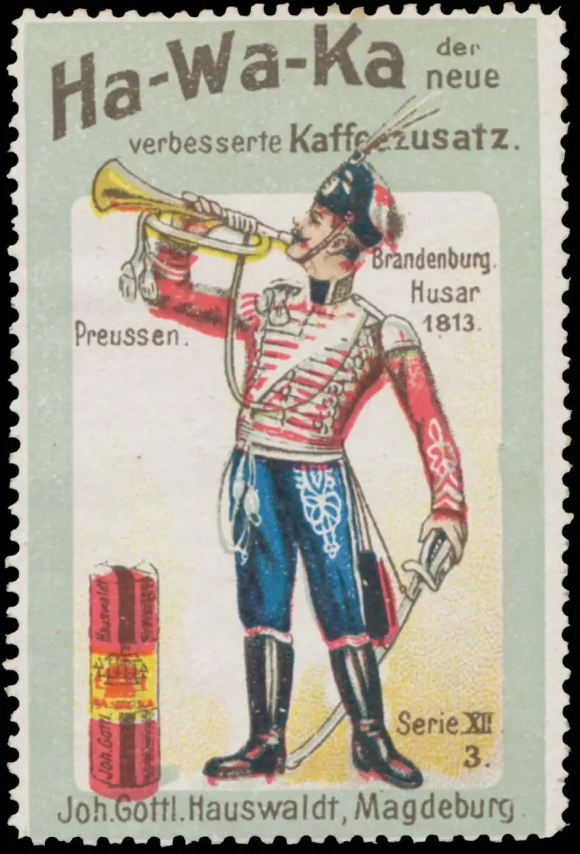 1813, Militär-Serie XII. 3, Ha-Wa-Ka der neue verbesserte Kaffeezusatz, Größe/Zustand: 6x4 , guter Zustand, Original alte Reklamemarke die seinerzeit für die Werbung benutzt wurde