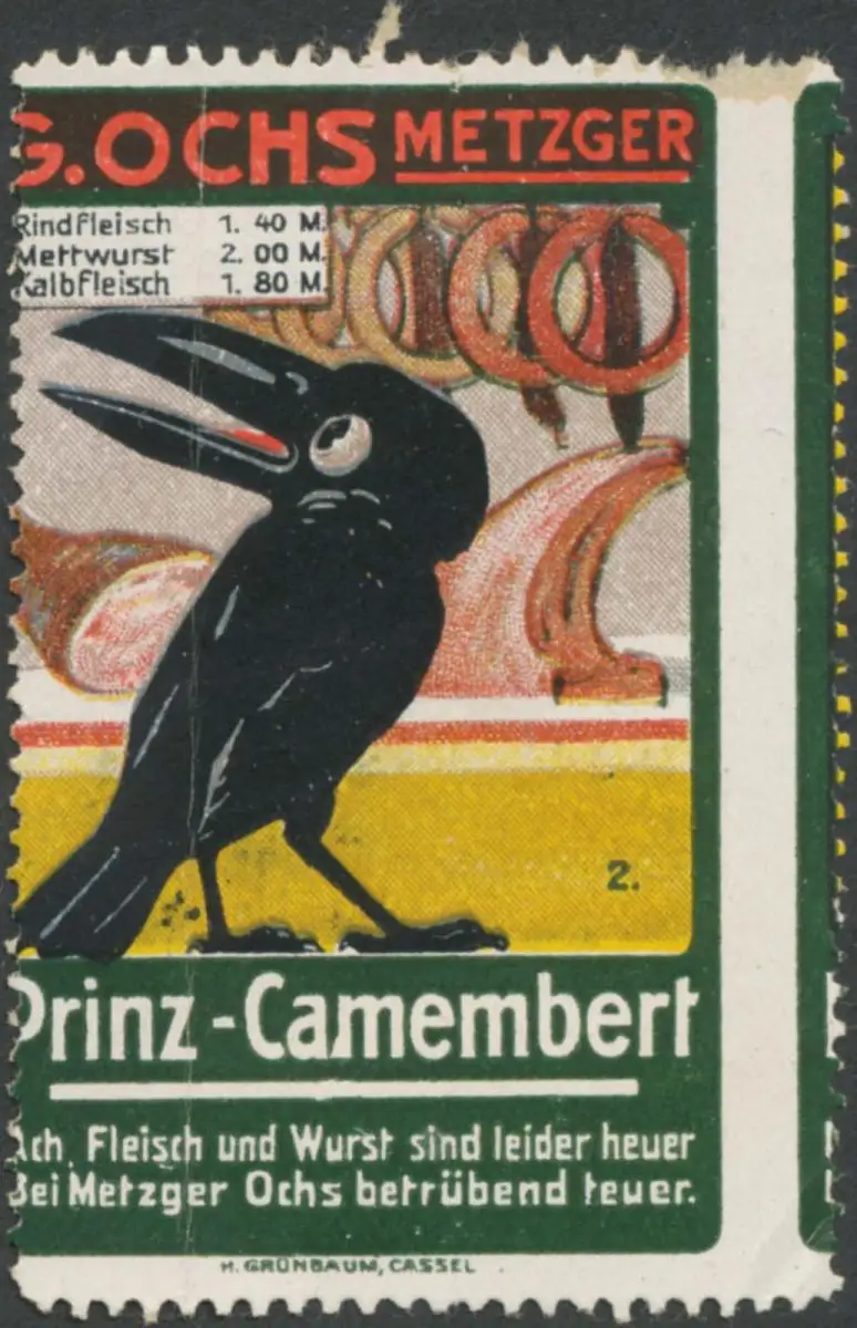 Ach Fleisch und Wurst sind leider heuer bei Metger Ochs betrübend teuer. G. Ochs Metzger, Rabe, Bild 2, Druck: H. Grünbaum, Kassel, Größe/Zustand: 6x4 , beschädigt, Original alte Reklamemarke die seinerzeit für die Werbung benutzt wurde