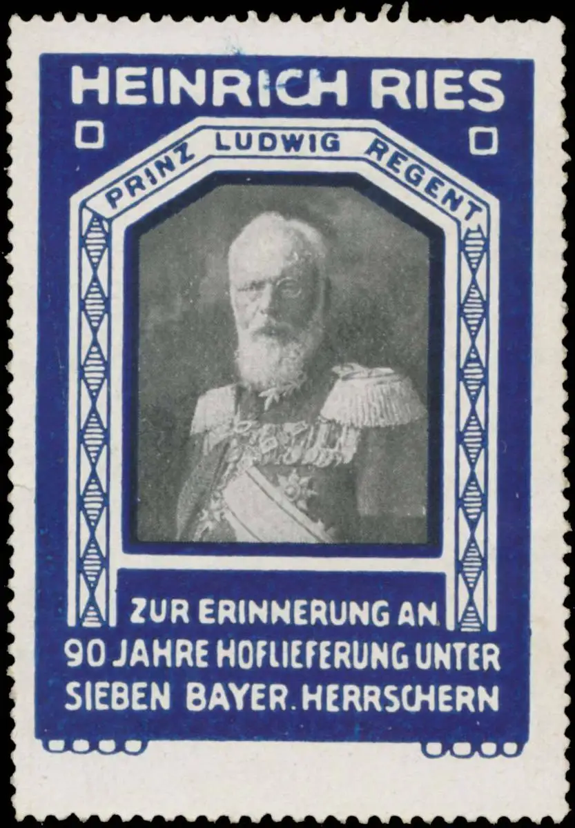 Heinrich Ries zur Erinnerung an 90 Jahre Hoflieferung unter sieben bayerischen Herrschern, Größe/Zustand: 6x4 , guter Zustand, Original alte Reklamemarke die seinerzeit für die Werbung benutzt wurde