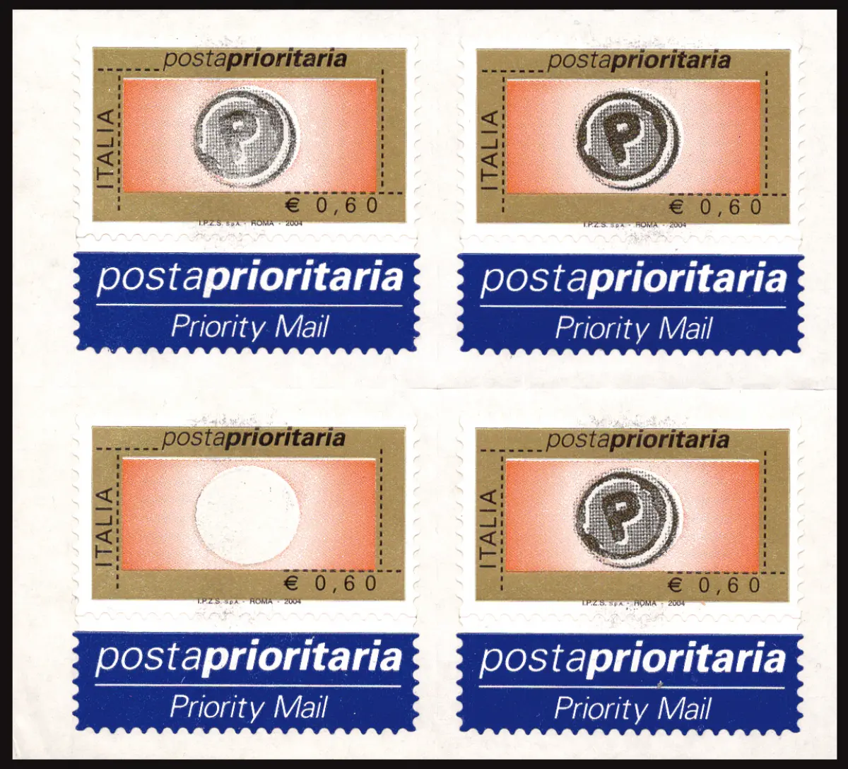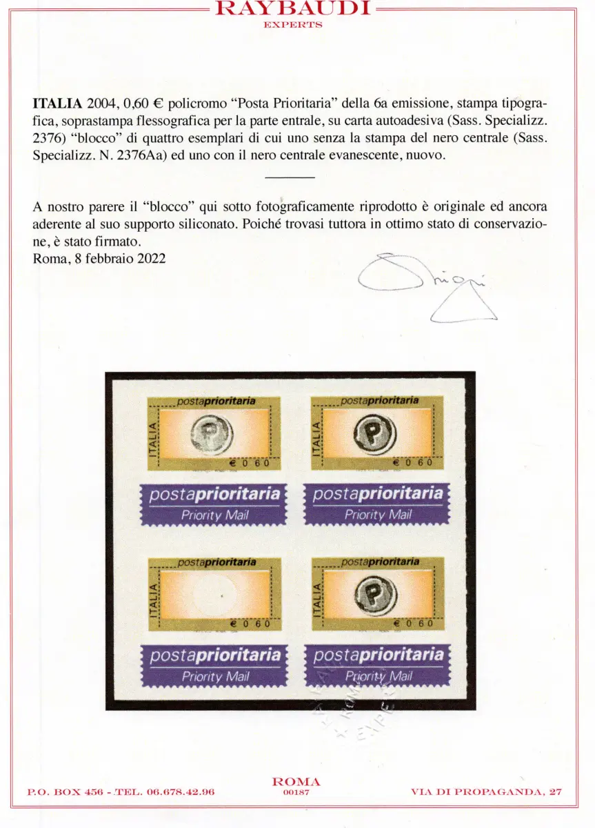 MNH - Vollgummi - Priority Post 2004 Euro 0,60 Nr. 2747 Block von vier Exemplaren, eines davon ohne Mittelschwarzdruck und eines mit verblassendem Schwarz (Sass. spec. n. 2376Aa) - auffällig und ungewöhnlich - Cert. Ray. Cod. 947/17