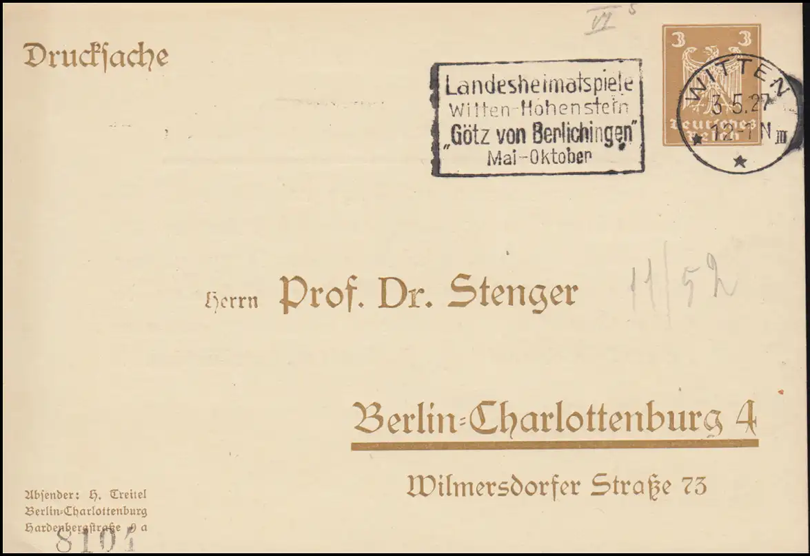 Werbestempel Landesheimatspiele auf Ganzsache als Drucksache WITTEN 3.5.1927 nach Berlin