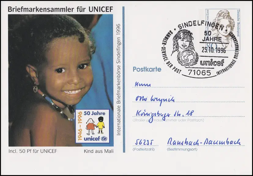 Privat-Postkarte UNICEF, SSt Sindelfingen 50 Jahre UNICEF 25.10.1996