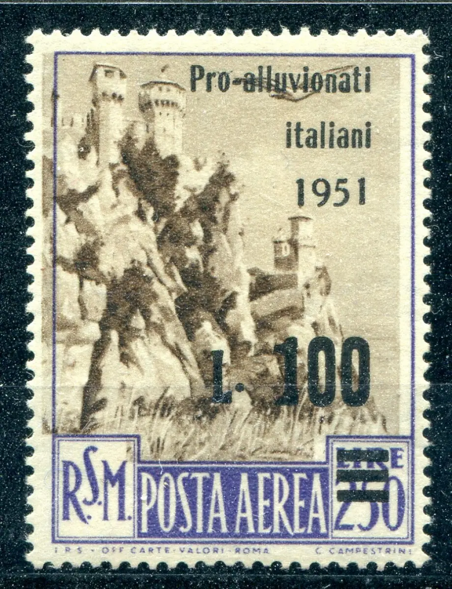Vollgummi - Pro Alluvionati Luftpost Lire 100 Nr. 100 Bodendruck nach links verschoben - Sorte nicht katalogisiert Nr. 772/L