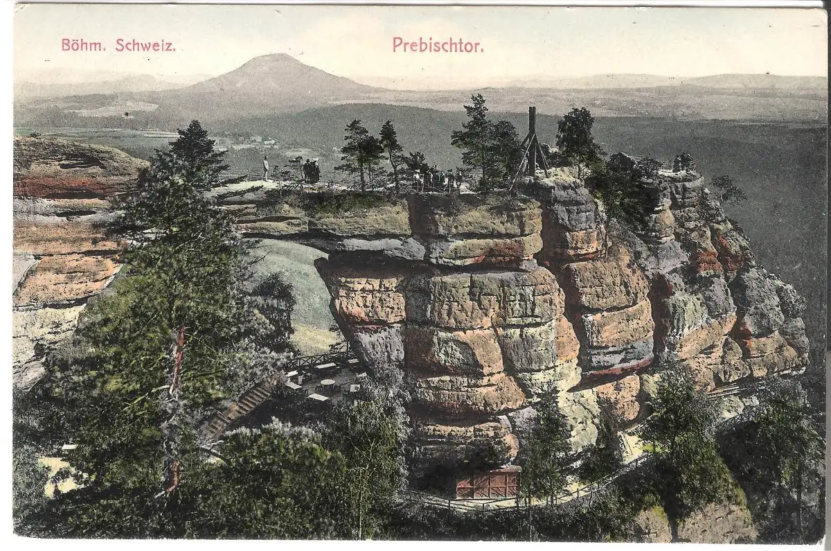 ### Probischtor - Böhmische Schweiz - siehe auch Briefmarken Im Jahr 1862 gründete hier Gustav Kreibich sein Unternehmen, welches sich unter anderem mit dem Verkauf von Fotografien und Ansichtskarten von Herrnskretschen befasste. Im Jahr 1898 wurden die Klammen des Kamnitzbachs erschlossen. Im Jahr 1879 entstehen in Herrnskretschen und Hohenleipa Sektionen des Gebirgsvereins für die Böhmische Schweiz ###