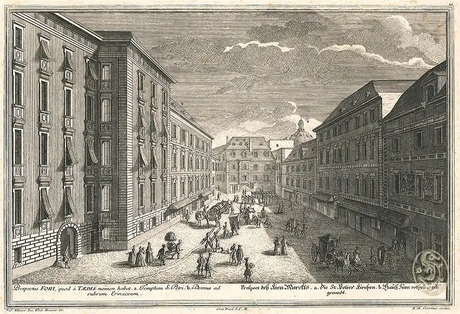 Augsburg, Pfeffel 1725. Orig.-Kupferstich von I. A. Corvinus aus Salomon Kleiner. Vera et accurata delineatio...Wahrhaffte und genaue Abbildung Aller Kirchen und Clöster.. 22,5 x 33,5 cm. (Bildausschn.). Breitrandiger, kräftiger Abdruck. Kl. Randläsuren.