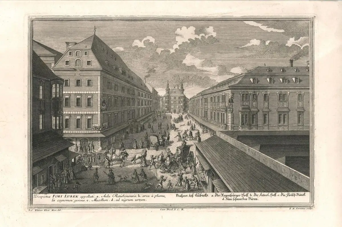 Augsburg, Pfeffel 1725. Orig.-Kupferstich von I. A. Corvinus aus Salomon Kleiner. Vera et accurata delineatio...Wahrhaffte und genaue Abbildung Aller Kirchen und Clöster.. 22,5 x 33,5 cm. (Bildausschn.). Breitrandiger, kräftiger Abdruck.
