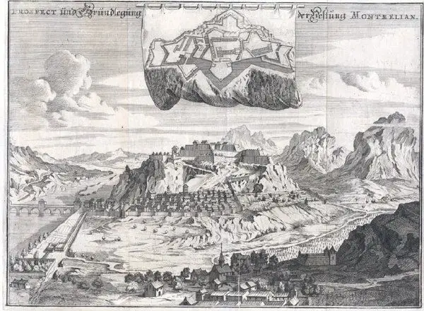 Bemerkungen: Ansicht von Montmélian bei Chambery in Savoyen mit einem Grundriss in der oberen Bildmitte.