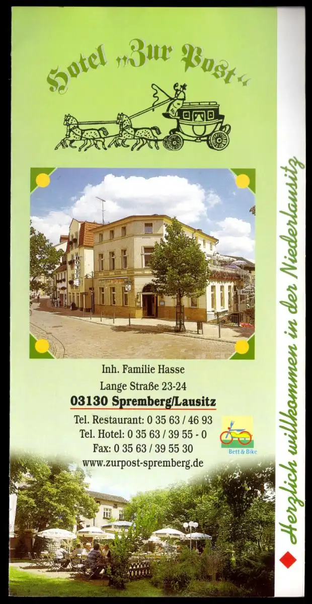 Prospekt, touristisches Faltblatt Spremberg Hotel "Zur Post" Erscheinungsjahr: o.J., um 2005 Format: 21 x 10 cm, gefaltet Versandgewicht: 20g Der