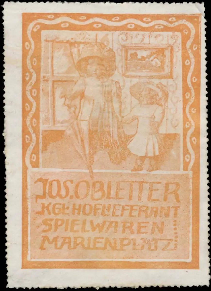 Spielzeug-Handlung, Kgl. Hoflieferant, Marienplatz, Spielwaren, Größe/Zustand: 8x6 , beschädigt, Original alte Reklamemarke die seinerzeit für die Werbung benutzt wurde