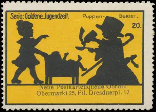 Serie: Goldene Jugendzeit. Neue Postkartenquelle in Görlitz, Bruno Hanzig, Ansichtskarten und Schreibwaren, Obermarkt 25, Filiale: Dresdner Platz 12, Größe/Zustand: 4x6 , guter Zustand, Original alte Reklamemarke die seinerzeit für die Werbung benutzt wurde