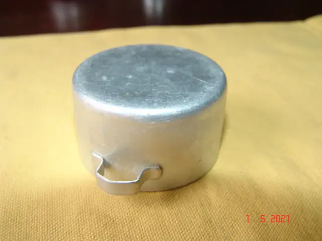 Topf mit roten Plastegriffen: Höne ca 3,3 cm, Breite über beide Griffe gemssen ca 7,7 cm, Ø ca 5,4 cm.