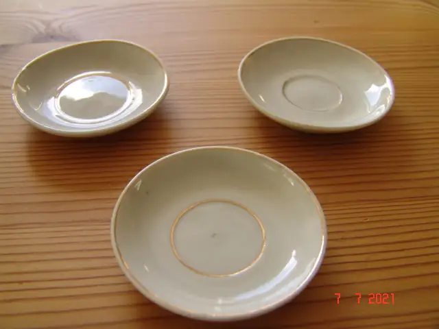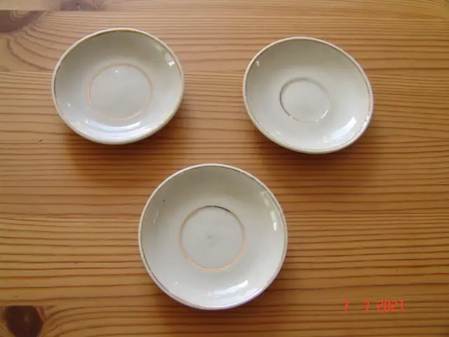 Angeboten werden 3 Teller aus weißem Porzellan mit Goldränder in altersgemäß sehr gutem Zustand.