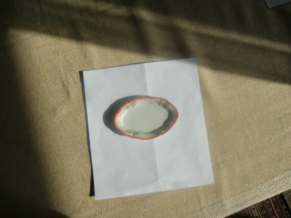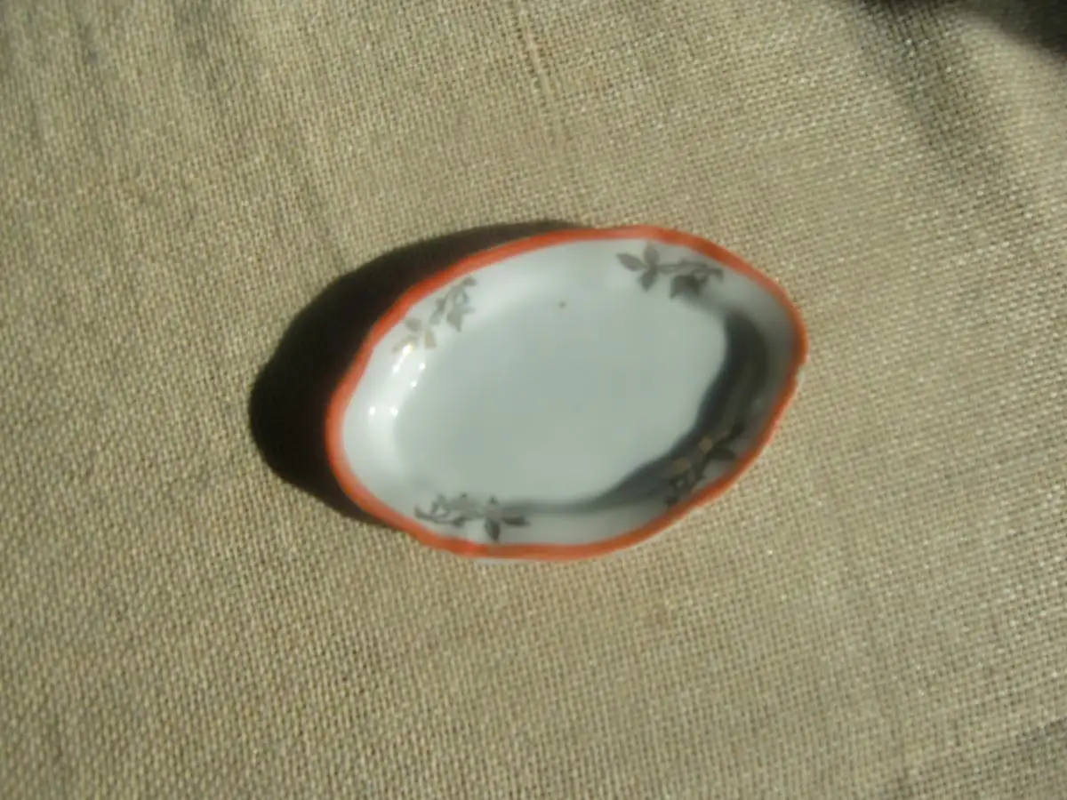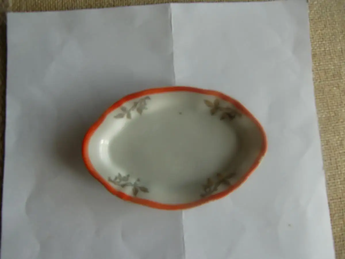 Angeboten wird ein alter Gebäckteller in gutem Erhaltungszustand. Der rote Rand hat nur wenig Abrieb und die silberfarbene Bemalung ist kaum berieben. Auf der Rückseite ( Foto 2 ) ist ein Abplatzer ( ca 1 cm x ca 0,8 cm ).