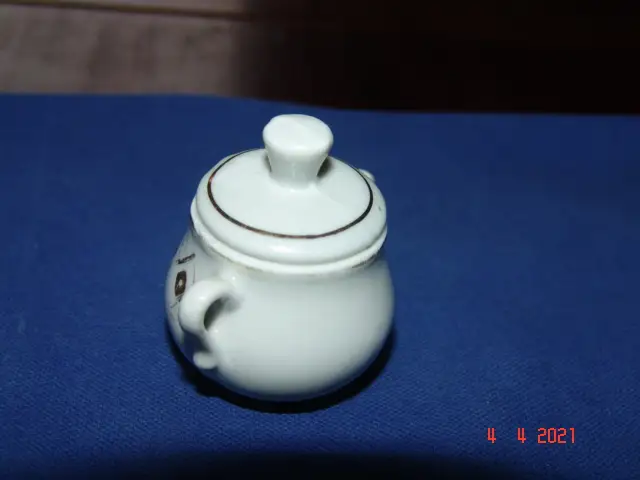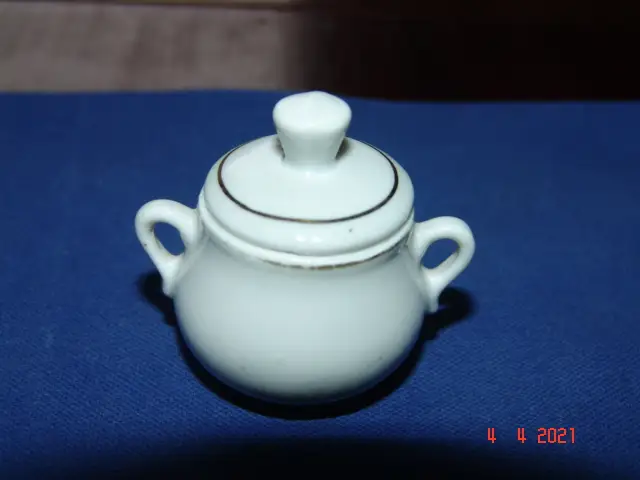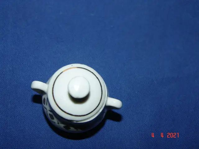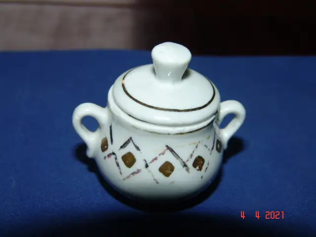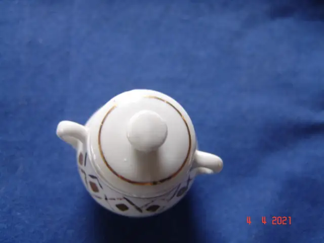 Angeboten wird eine weiße Terrine mit Deckel und Henkel, aus Porzellan. Die Zuckerdose hat ein Golddekor und schwarze Rauten auf der Vorderseite, der Deckel ist mit Griff und hat einen unberiebenen Goldrand.