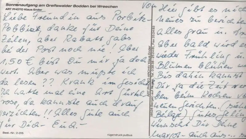 Ich hatte die Rechnung sofort als Vorkasse bezahlt, aber keine Zusendung der Karte erhalten. Trotz Nachfrage keine Rückmeldung bzw. Erklärung. Da es sich zum Glück nur um 1,70 € handelt, ist die Sache für mich erledigt, ärgerlich, aber zu verkraften. Mit den drei anderen Karten, die ich bestellt hatte, hat alles wunderbar geklappt.
