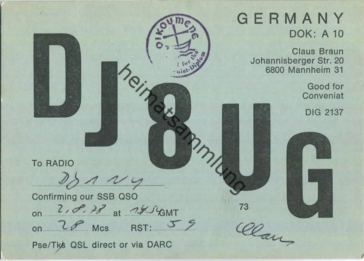 QSL - QTH - Funkkarte - DJ8UG - Mannheim