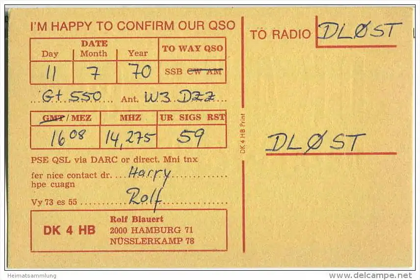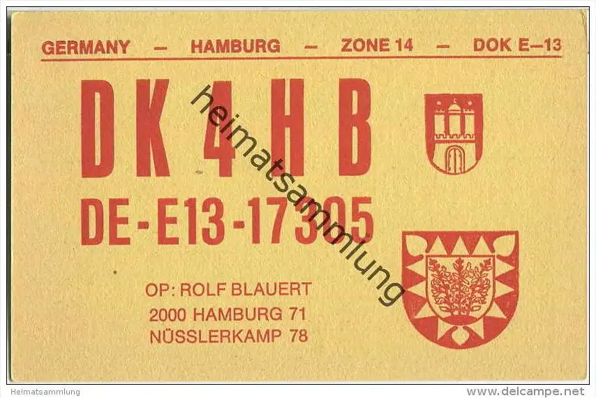 QSL - QTH - Funkkarte - DK4HB - Hamburg - 1970