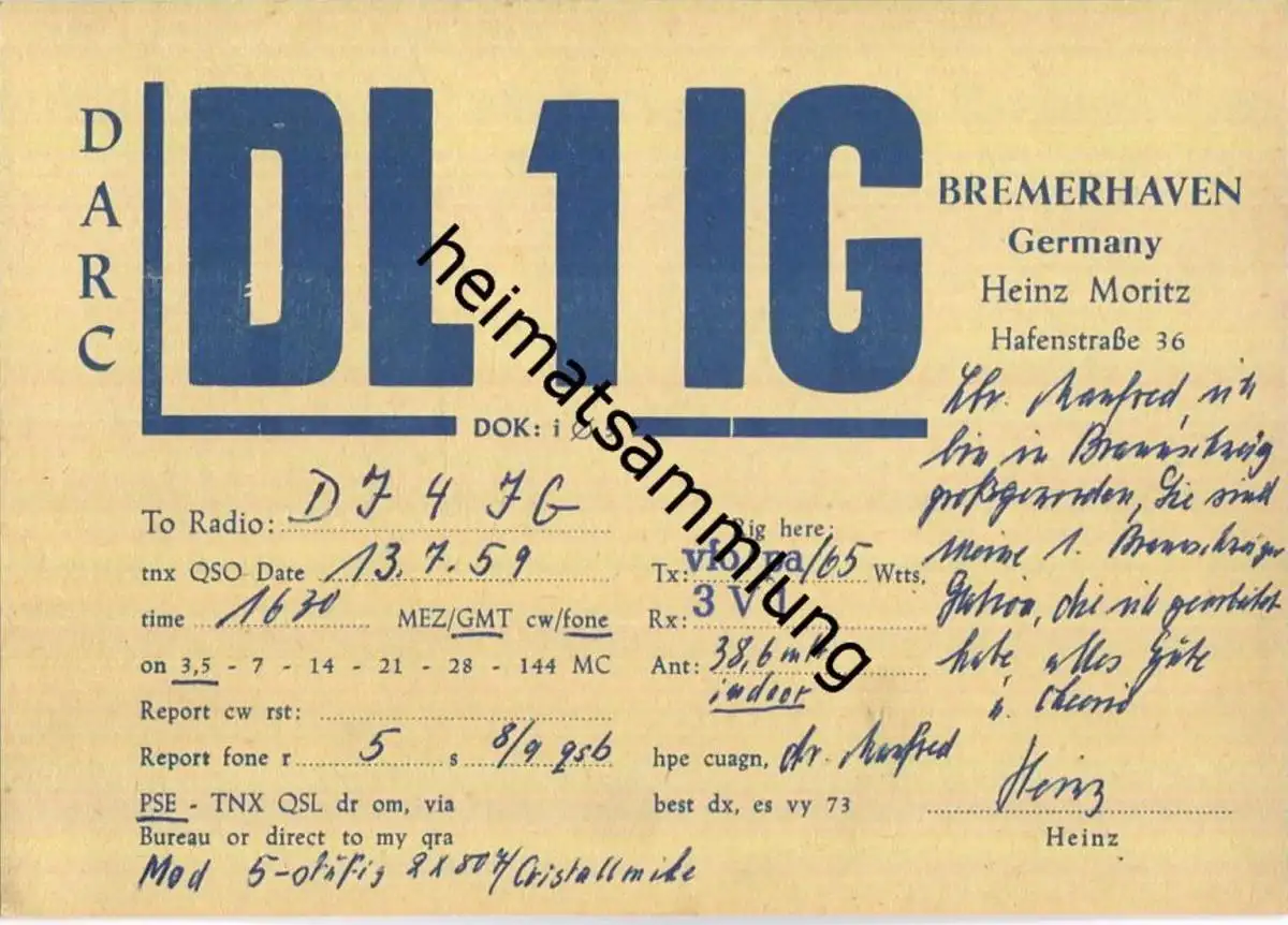QSL - QTH - Funkkarte - DL1IG - Bremerhaven - 1959