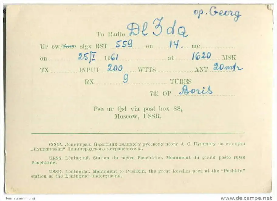 QSL - QTH - Funkkarte - UJ8FAA - Russland - Moskau - 1961
