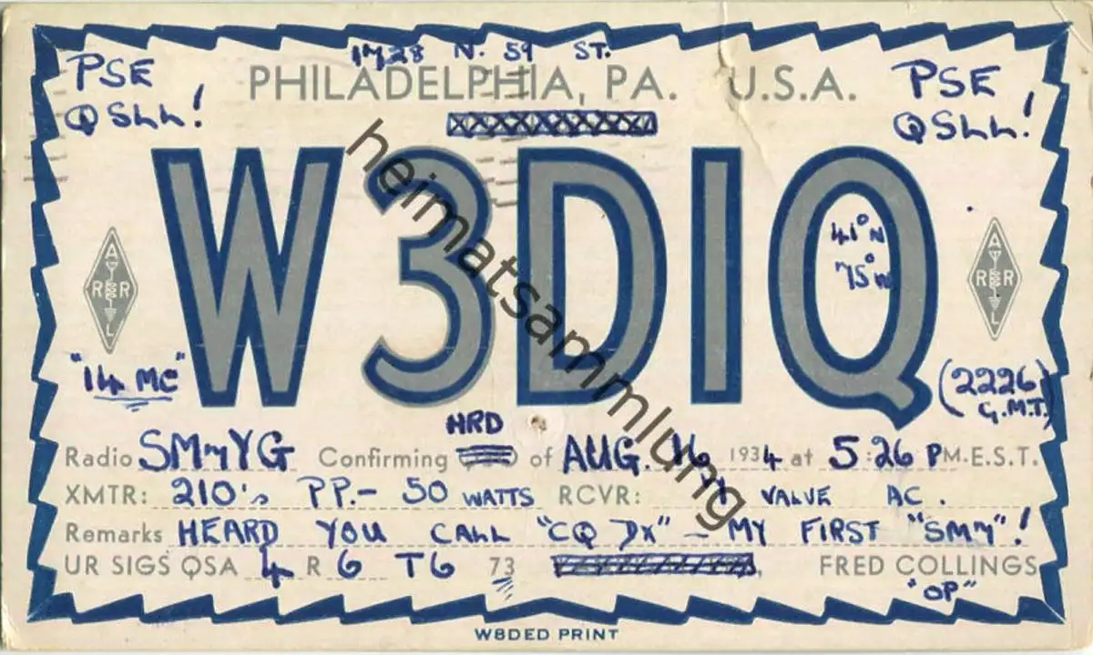 QSL - Radio - W3DIQ - USA - Philadelphia PA. - 1934