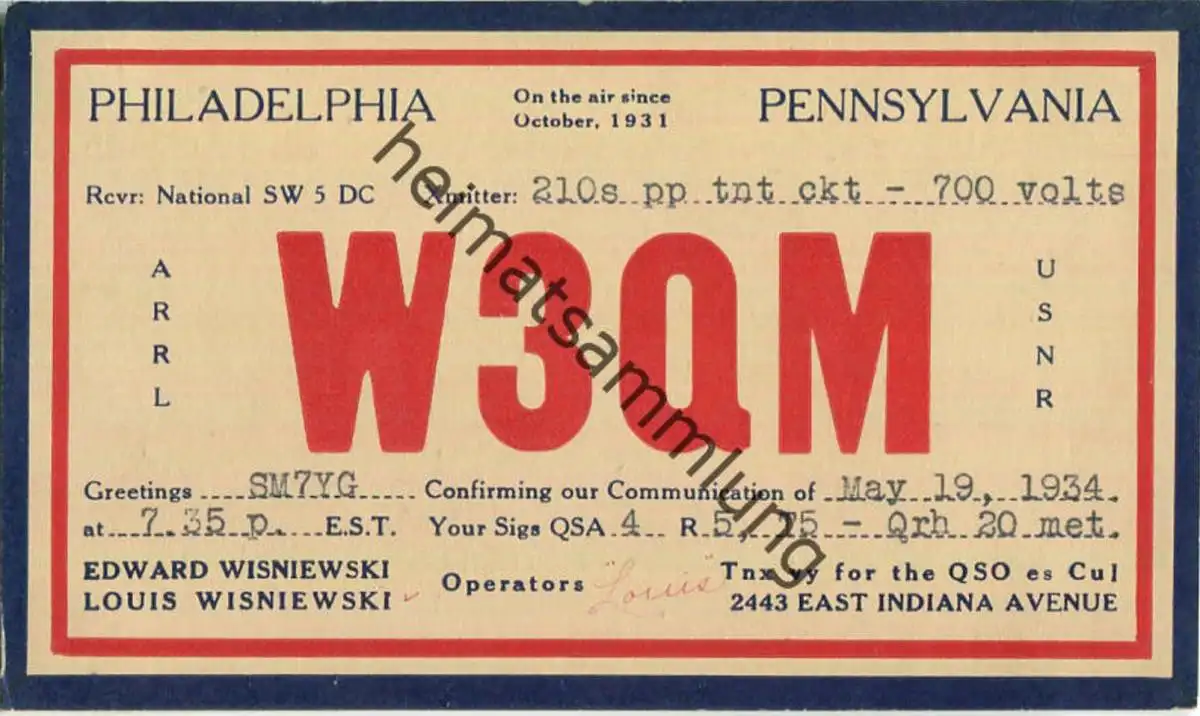 QSL - Radio - W3QM - USA - Philadelphia PA - 1936
