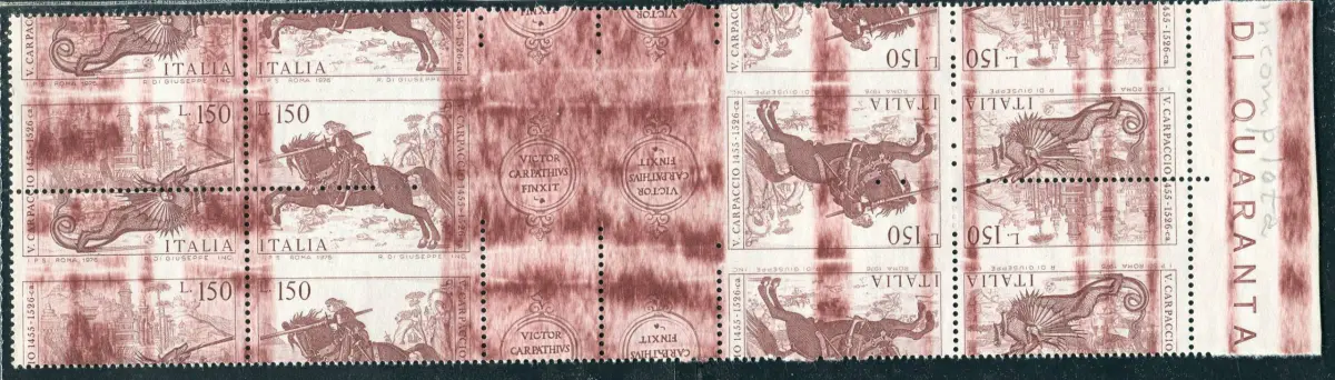 Carpaccio Nr. 1340/1341 Viertel mit großen und weit verbreiteten Druckflecken und stark vertikal verschobener Verzahnung - auffällig und ungewöhnlich Cod. 835/5