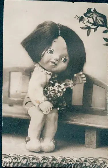 Quietsch Ak Puppe mit Blumenstrauß, Frosch, Biene