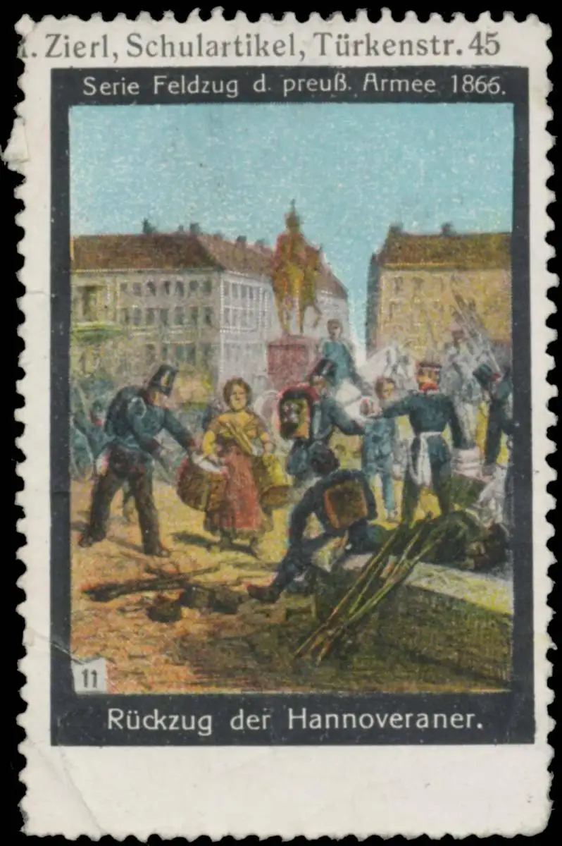 Serie: Feldzug der preußischen Armee 1866, Bild 11, M. Zierl Schulartikel, Türkenstraße 45, Größe/Zustand: 6x4 , beschädigt, Original alte Reklamemarke die seinerzeit für die Werbung benutzt wurde