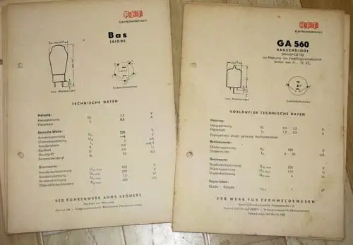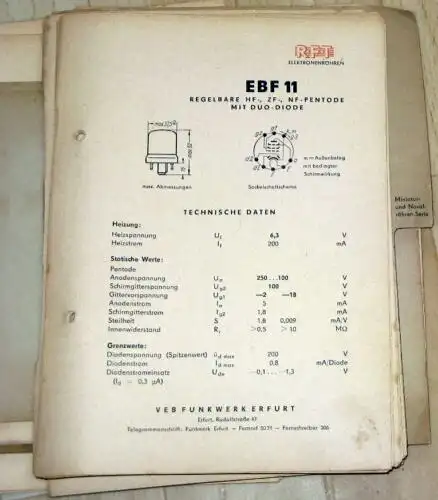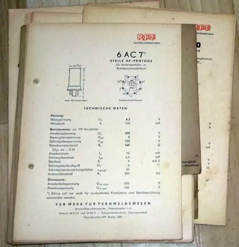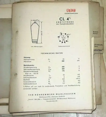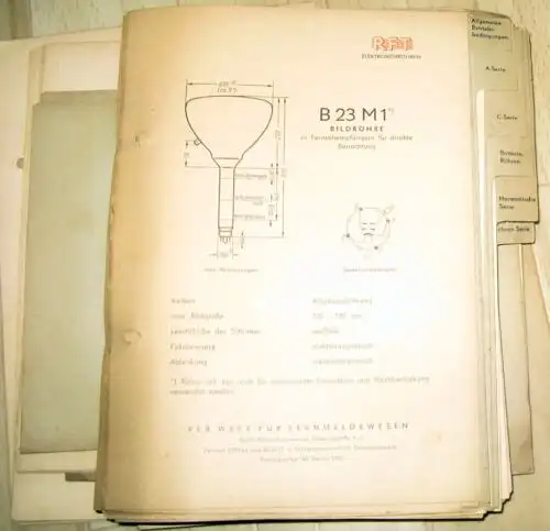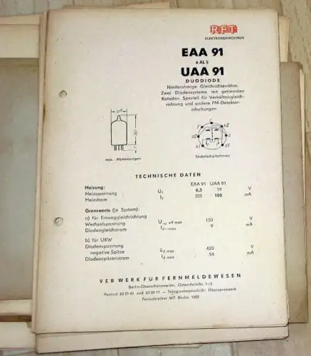 mittlerer bis guter Zustand, Gebrauchs- und Alterungsspuren:Papier vergilbt, aber Seiten überwiegend sauber und ordentlich, gelegentlich gering stockfleckig - Titel mit Stempeln und Nummern - Seiten teils etwas eselsohrig - Ecken und Ränder gelegentlich mit kleinen Blessuren - der original Ordner war nicht mehr zu retten, die original gelochten Seiten werden jetzt von einem neuen Dummy zusammengehalten - laut Inhaltsverzeichnis fehlen die Datenblätter von 5 Röhren, Mit der vorliegenden Mappe übergeben die Röhrenwerke der DDR eine Zusammenstellung der wichtigsten technischen Daten aller z. Z. in diesen Werken gefertigten Röhren. Darüber hinaus werden bereits die vorläufigen technischen Daten der z. Z. noch in der Entwicklung befindlichen und erst in Kürze in die Fertigung zu übernehmenden Röhren veröffentlicht. Die auf den einzelnen Röhrenblättern angegebenen technischen Daten können in fünf Gruppen eingeteilt werden: - Heizdaten - statische Werte - Betriebsdaten - Grenzwerte - Kapazitäten ...Katalog enthält - A-Serie - C-Serie - Harmonische Serie - Miniatur-Serie - Oktalröhren - Netzgleichrichterröhren - Technische Röhren - Spezialröhren - Bildröhren, Papier, ca. 16,5 x 20,5, lose-Blatt-Sammlung mit 193 Blatt = rund 350 Seiten mit zahlreichen Bildern