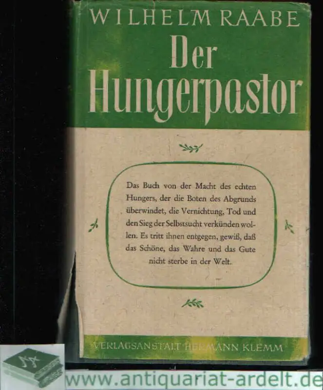 das Erscheinungsjahr ist geschätzt, Seitenschnitt leicht fleckig, Seitenkanten bestoßen, Raabes `Hungerpastor ` ist der echteste und ehrlichste Roman über den deutschen Bürger und für ihn. Er erfasst ihn so völlig und so wahrhaft in seiner rührenden Idealdurchschnittlichkeit, dass es für jede Generation immer wieder zum Erlebnis werden muss, dieses Buch zu lesen, das Raabe bis heute - über alle anderen, zum teil moderneren und dichterisch tiefgehender Werke hinaus - populär und berühmt gemacht. (vom Umschlag) Ein verträumter Schusterssohn und Theologe namens Hans Unwirrsch, der sich nach Licht, Wärme und Liebe sehnt und sein Jugendgefährte, der jüdische Trödelssohn Moses Freudenstein, der schon in jungen Jahren nach Geld, Macht u. Erfolg strebt. (aus dem Buch) Beschreibung vom Antiquariat Ardelt 1b5b Antiquariat Ardelt